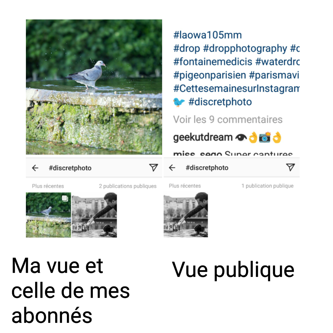 Désormais mes photos ne sont plus du tout visible sur les Hashtags : Ni par mes abonnés ni par moi. Celles qui étaient encore visibles antérieures à 2015 jusqu’à mes début en 2012 ne le sont plus.